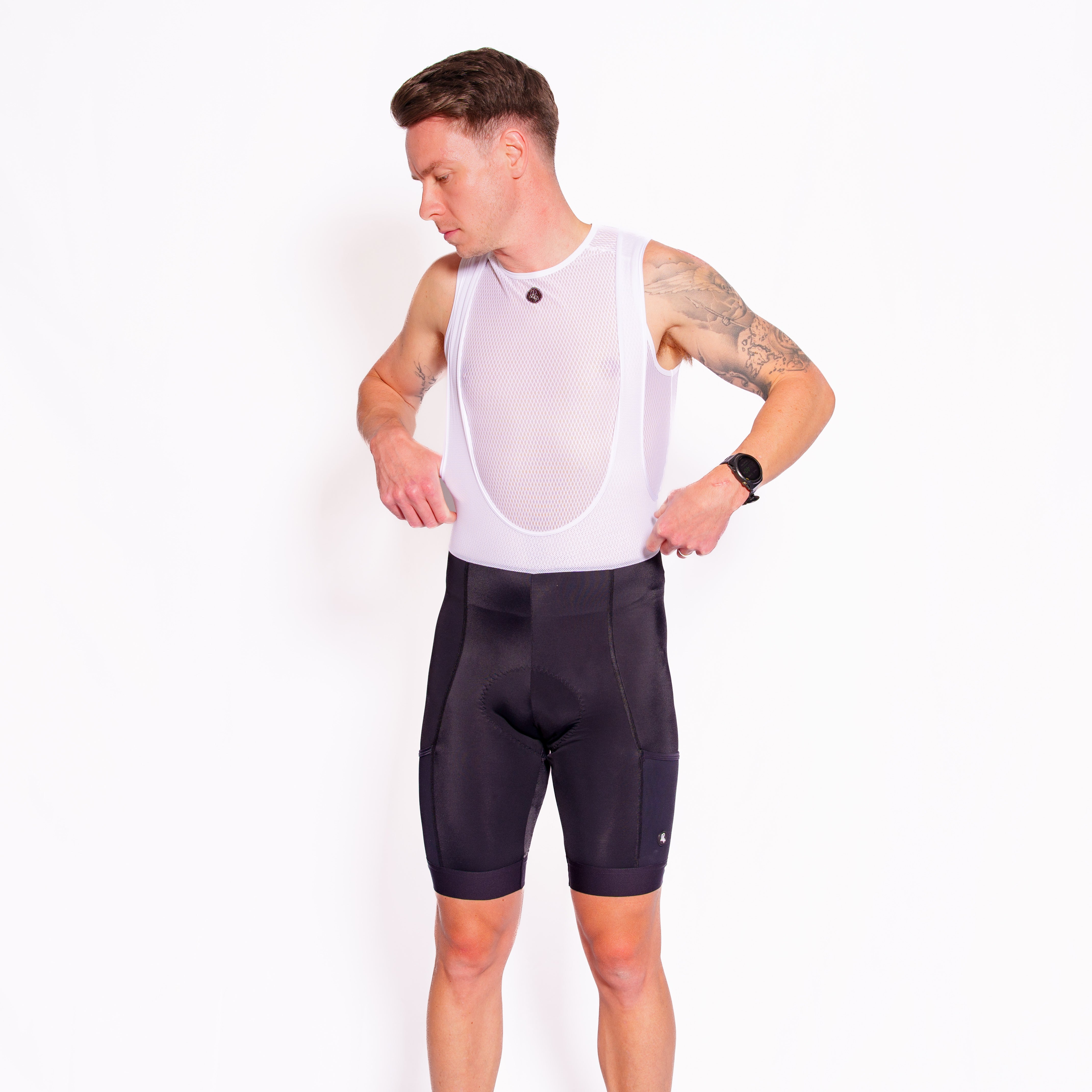 Great for storing and accessing your stuff on the go. Two additional mesh pockets are located on the bib strap at the back of the shorts also.